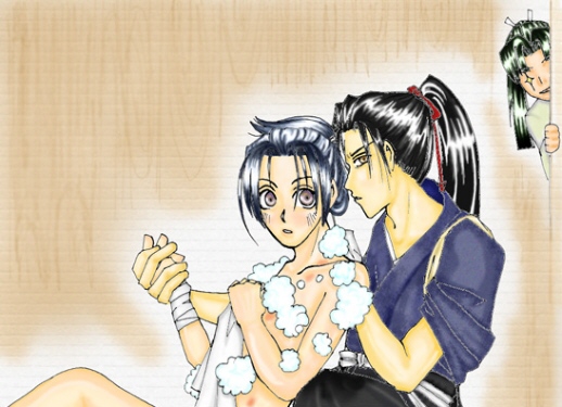 総ちゃんのシアワセ♪ 番外〜お風呂でシアワセ♪〜 総ちゃんは今お風呂で土方さんに「しゃぼん」で洗って貰っています。 土方さんが松前屋さんから「しゃぼん」を良く泡立てて、それで洗うとお肌がぴかぴかになると聞いたからです。 土方さんは早速「しゃぼん」を松前屋さんから買いました。 それはとっても珍しい舶来のものだったので、すごく高かったのですが、総ちゃんのためならお金に糸目をつけない土方さんは、勘定方の河合さんを脅して買ったのです。 河合さんはねちねち一刻も文句を言い続けたので、土方さんは「嫌な奴」と思いましたが、総ちゃんのお肌を磨く為にじっと我慢してお金を貰いました。 ひいては自分の楽しみにもなるからです。こういう時の手回しの良さと忍耐は見上げたものです。 泡だらけの総ちゃんの白いすべすべのお肌から、ときおり桜色の土方印が見え隠れします。 土方さんはシアワセでした。 その時土方さんの耳にお風呂の板戸の向こうから、最近では伊東さんより嫌な声が聞こえてきました。 『よぉ、総司、土方さんに洗って貰ってるんだって?』八郎さんの声は良くとおります。 あんまり気持ち良くてうつらうつらしていた総ちゃんは、いきなり目が覚めて、次には心臓がどきどきしてきました。 おろおろと土方さんを見ると、今日は妙に落ち着いています。 はてな?と思ってみていると、土方さんは八郎さんに声を掛けました。 『伊庭、そこにある「しゃぼん」の残りをとってくれ』 『戸を開けてもいいのかえ?』 『いいぞ』土方さんは楽しげに言いました。 総ちゃんはびっくりして、目をぱちくりさせてしまいました。 いつもはあんなに警戒をしている八郎さんに、妙に寛大な土方さんが気になります。 実は土方さんは総ちゃんのお肌にほんのり残る「土方印」を、八郎さんに見せ付けてやろうと思っているのです。 上手いことに、「しゃぼん」の泡で総ちゃんのお肌は適度に隠れています。 全部見られちゃう心配はありません。 ちらちらと薄紅色の「土方印」を見せて、八郎さんに一泡吹かせてやろうと思ったのです。 (泡吹いて地団駄踏め!伊庭)土方さんはお腹の中で笑いがとまりません。 『じゃ、開けるよ』八郎さんはガラリとお風呂の板戸を開けました。 八郎さんは総ちゃんのお肌にちらちら残る「土方印」を見て、動けないようです。 物音ひとつしません。 (ざまーみろ)土方さんは内心、声高らかに一句捻りたい位でしたが、お顔は「新撰組副長用」を崩せません。 『土方さん・・・・』八郎さんの何だか寂しそうな声がしました。 余裕のお顔をして土方さんが振り向くと、八郎さんは「お手上げ」の仕草をして、首をふりふりと振りました。 『あんたって人はいつまでたっても、誰にでもオンナジ場所に印つけてんだねぇ・・・まぁそんだけ几帳面でなけりゃ新撰組副長なんざ勤まらないわなぁ』 八郎さんのけたけた笑う声が、お風呂中に響き渡ります。 『総司、早く上がれよ。今日は土方さんが女に手を出してしくじった店の手拭じゃないぞ。丹波の白羽二重で特別に作らせた柔らかい手拭で拭いてやるからな』 八郎さんはいつのまにか、お高そうなしっとりとした手触りの手拭を持って総ちゃんを待っています。 『のぼせる場所を間違えちゃぁいけねぇよ』 八郎さんはもう一度大きな声で笑いました。 総ちゃんがいつのまにか潤んでしまったお目目で土方さんを見ると、土方さんはぶくぶくと泡に沈んでいました。 総ちゃんはその泡がひとつ上にのぼって、途中でぱちんとはぜちゃったのを、ぼんやりと見ていました。 シアワセってあぶくのようだな・・・と、うつろな心で思いました。 その時土方さんは泡に沈みながら、勝っちゃんに「私ノ金策ヲ許サズ」を破っちゃったのがバレル前に河合さんを切腹させちゃおうかな・・と、ふと思いました。 土方さんは八つ当たりとういう言葉を知りません。やれやれ困ったものです。 |