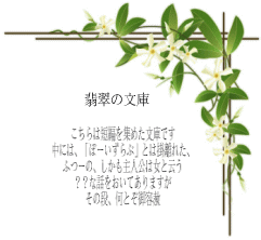 | 兵馬 U | 田坂さんの兄-ちゃん、兵馬さんと、今回は膳所のお殿様の話です。新撰組でも何でも無いのですが、「兵馬T」のお話は、琥珀の文庫・水晶に展示してあります。宜しかったら、お時間の有り余った時に覗いて頂ければ幸甚です。(そーすると、ちょびっと話が通じるかと、思います。……かも…) それから、話の最後に、後日譚を入れました。こちらは、やはり琥珀の文庫・きりリクの、「藤色恋歌」に通じます。なんちゃってヤオイで、スミマセン、スミマセン。。。(…長い言い訳) |